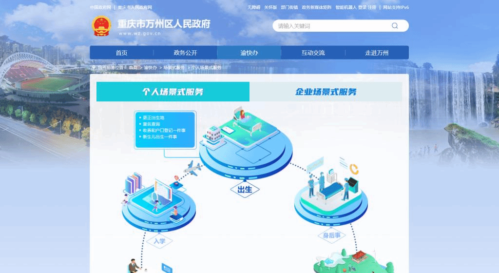 该页面分为个人服务和企业服务两个功能模块,面向个人的综合办事服务功能贯穿个人出生、入学、就业、住宿、住房、 婚姻、 生育、养老等。面向企业的服务功能贯穿企业开本、投资审批、 优惠扶持等。