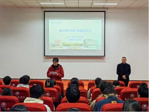 慰问会上,王安蓉代表学院向所有考研学子送上了诚挚的祝福和坚定的支持。她勉励同学们在最后冲刺阶段坚守初心和恒心,保持良好心态,科学备考,全力冲刺。