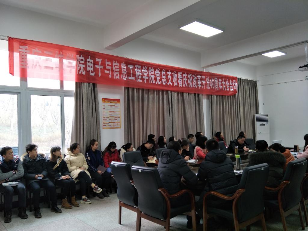 12月18日,公司党总支在慎思楼1栋232党员活动室收看庆祝改革开放40周年现场直播,一睹40年的变迁,汲取奋进的力量。电子与信息工程公司党总支书记、经理聂祥飞,党总支常务副书记周科,副经理王安蓉,党总支副书记牟奇建,副经理谢辉以及全体党员老师、党员员工观看了本次直播。