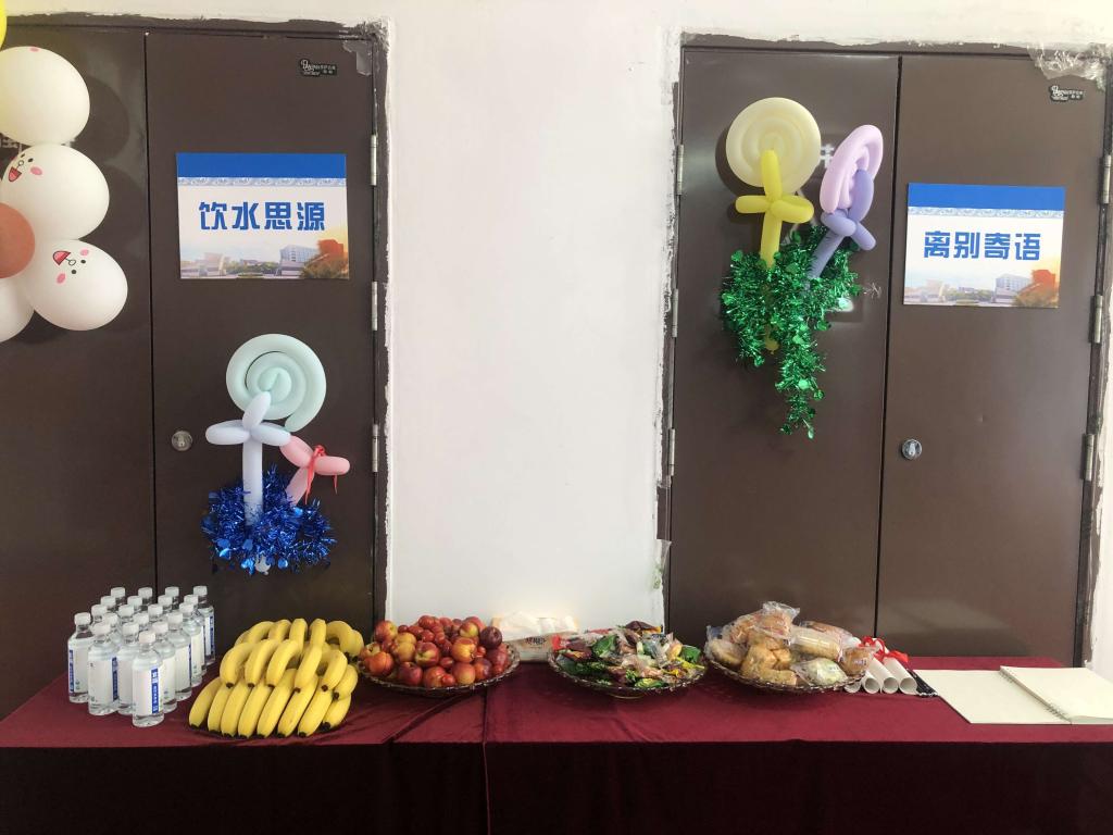 据了解,为了筹备本次毕业生欢送会,学院进行了精心的准备。铺设了红地毯、设置了签名墙、准备了水果盘和饮料台,活动现场布置十分温馨。此外,还提前录制了祝福视频,制作了反映员工老员工活的“美好回忆”剪影视频,在现场循环播放。
