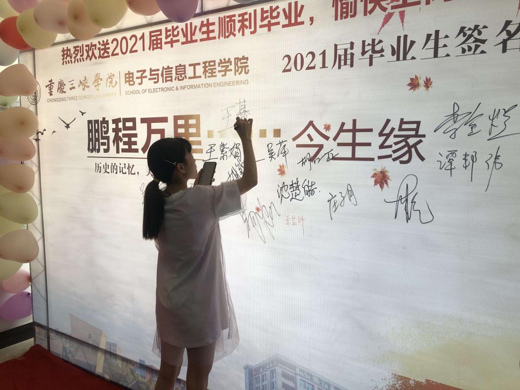 集团纪委书记李金斌及学院全体领导一早来到活动现场,与毕业生亲切交谈,为毕业生送上临别祝福,并与毕业生合影留念。部分毕业生还穿上学士服,邀请领导和导师为其拨穗,体验学业丰收的喜悦。毕业生们在签名墙上签下自己的名字,在留言薄上写下一段段对母校的美好祝愿。同窗数年的同学们在布置精美的签名墙前合影留念,不少同学还在现场与领导、老师话家常,聊未来。循环播放的“美好回忆”和祝福视频让毕业生感触颇多,不少同学留下了感动的泪水。活动现场人头攒动,场面温馨而热烈。